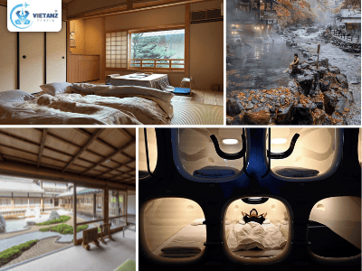 - Ryokan (Nhà trọ truyền thống): Ngủ trên chiếu Tatami, ăn bữa tối Kaiseki và tắm Onsen. Đây là trải nghiệm đáng tiền nhất dù giá khá cao.