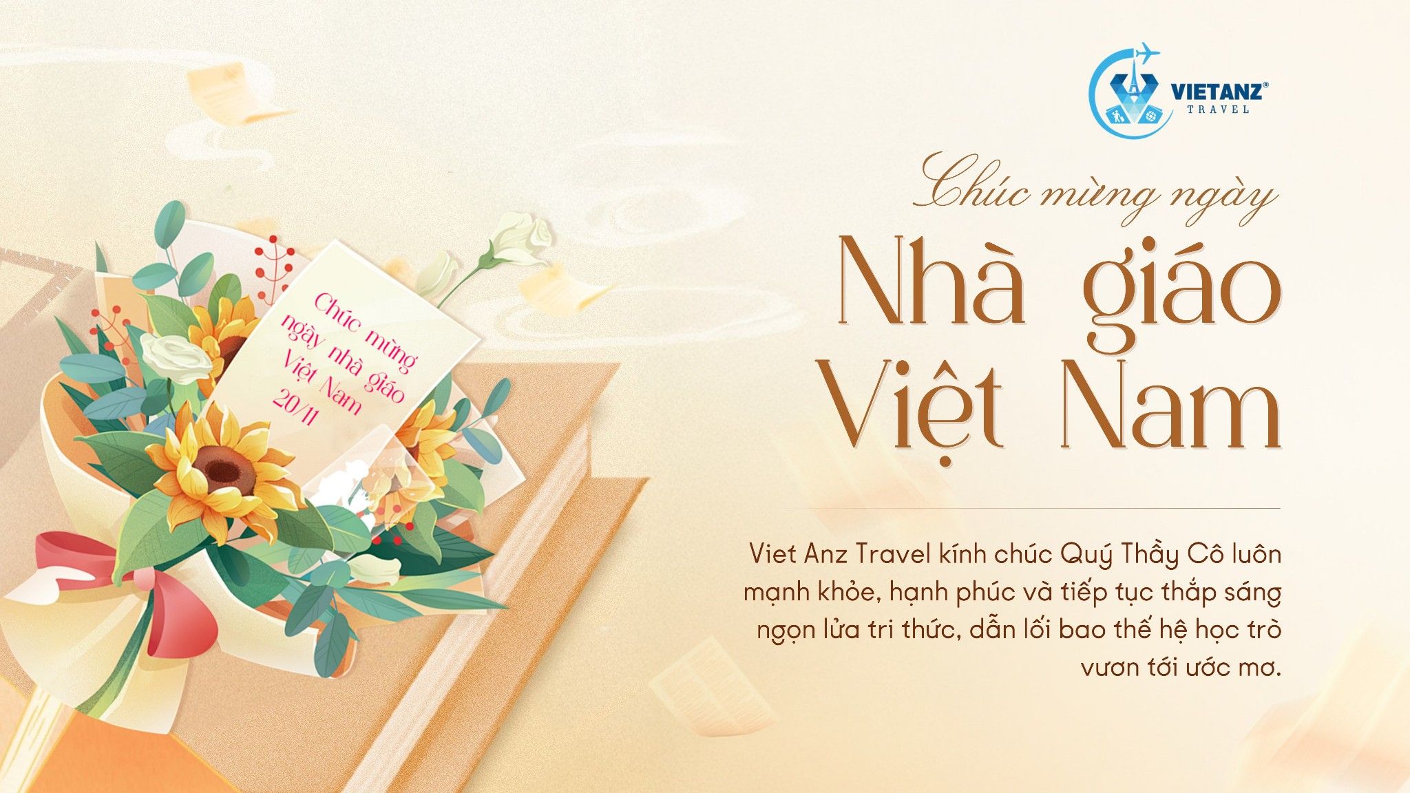 Nhân ngày Nhà giáo Việt Nam , Viet Anz Travel xin gửi lời tri ân và kính chúc tốt đẹp nhất đến các Thầy/Cô giáo, và toàn thể Quý khách hàng đã, đang công tác trong ngành giáo dục. Chúc Thầy Cô luôn mạnh khỏe, hạnh phúc và gặt hái nhiều thành công trong sự nghiệp trồng người cao quý!