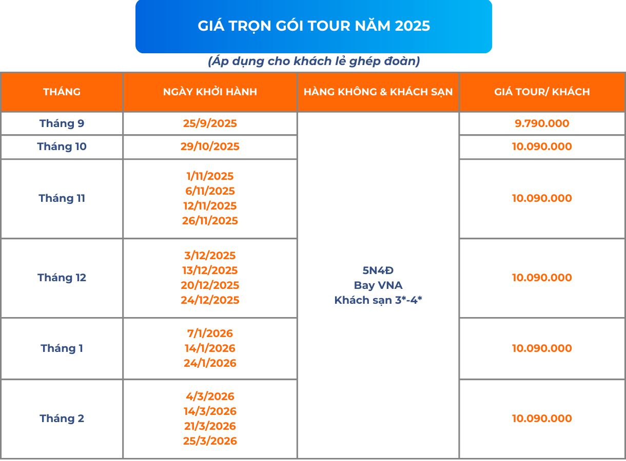 LƯU Ý: GIỜ BAY CÓ THỂ THAY ĐỔI THEO LỊCH CỦA HÀNG KHÔNG VIETNAM AIRLINES. NẾU GIỜ BAY BỊ THAY ĐỔI, CHÚNG TÔI SẼ SẮP XẾP LẠI LỊCH TRÌNH NHƯNG VẪN ĐẢM BẢO ĐẦY ĐỦ CÁC ĐIỂM THĂM QUAN NHƯ ĐÃ CAM KẾT.
